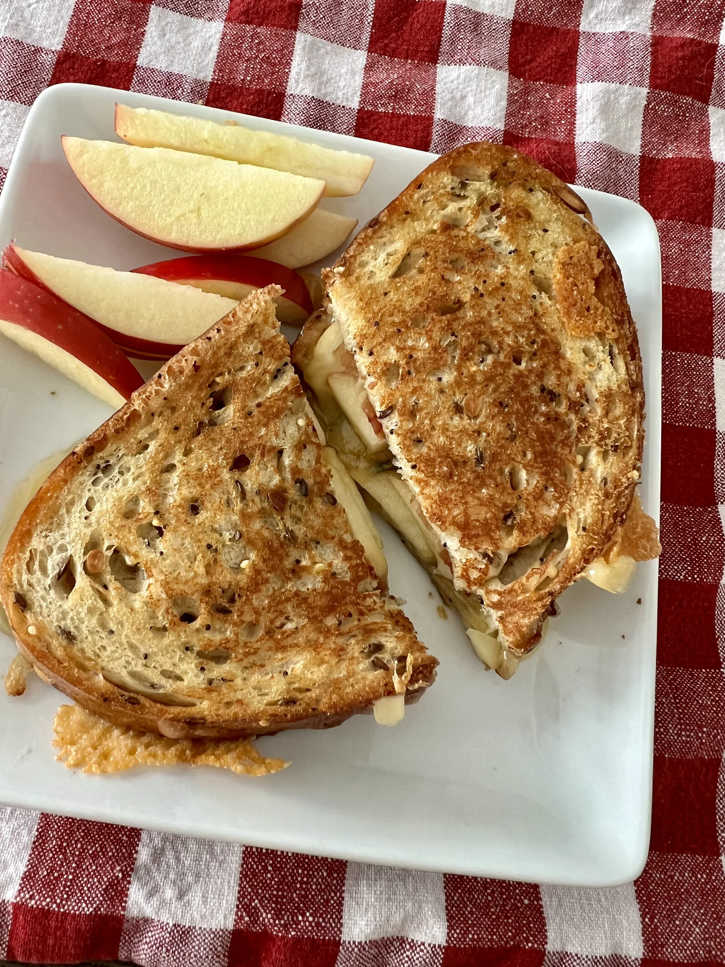 My goal for this month, and next month has been to eat the food out of our pantry and freezer while only buying fresh produce that I need. So lunch on Saturday was a yummy Gouda, thyme, apple, bacon, and honey grilled cheese sandwich.