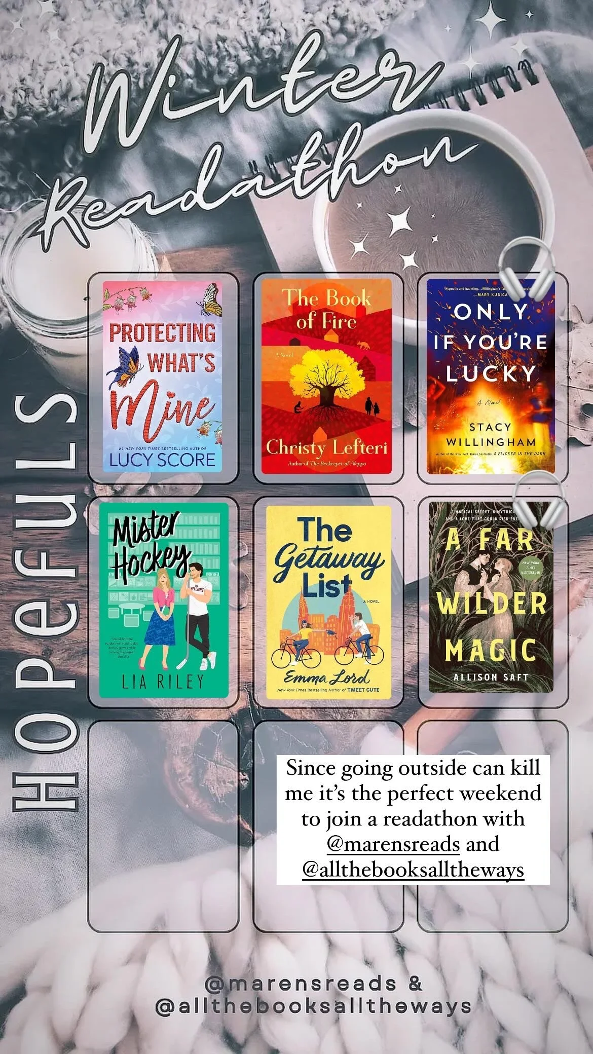 I also joined in readathon for the weekend, since I knew I was going to be inside and unable to really do anything. Yesterday I was able to finish Mister Hockey along with the audiobook version for Only if Youโre Lucky.